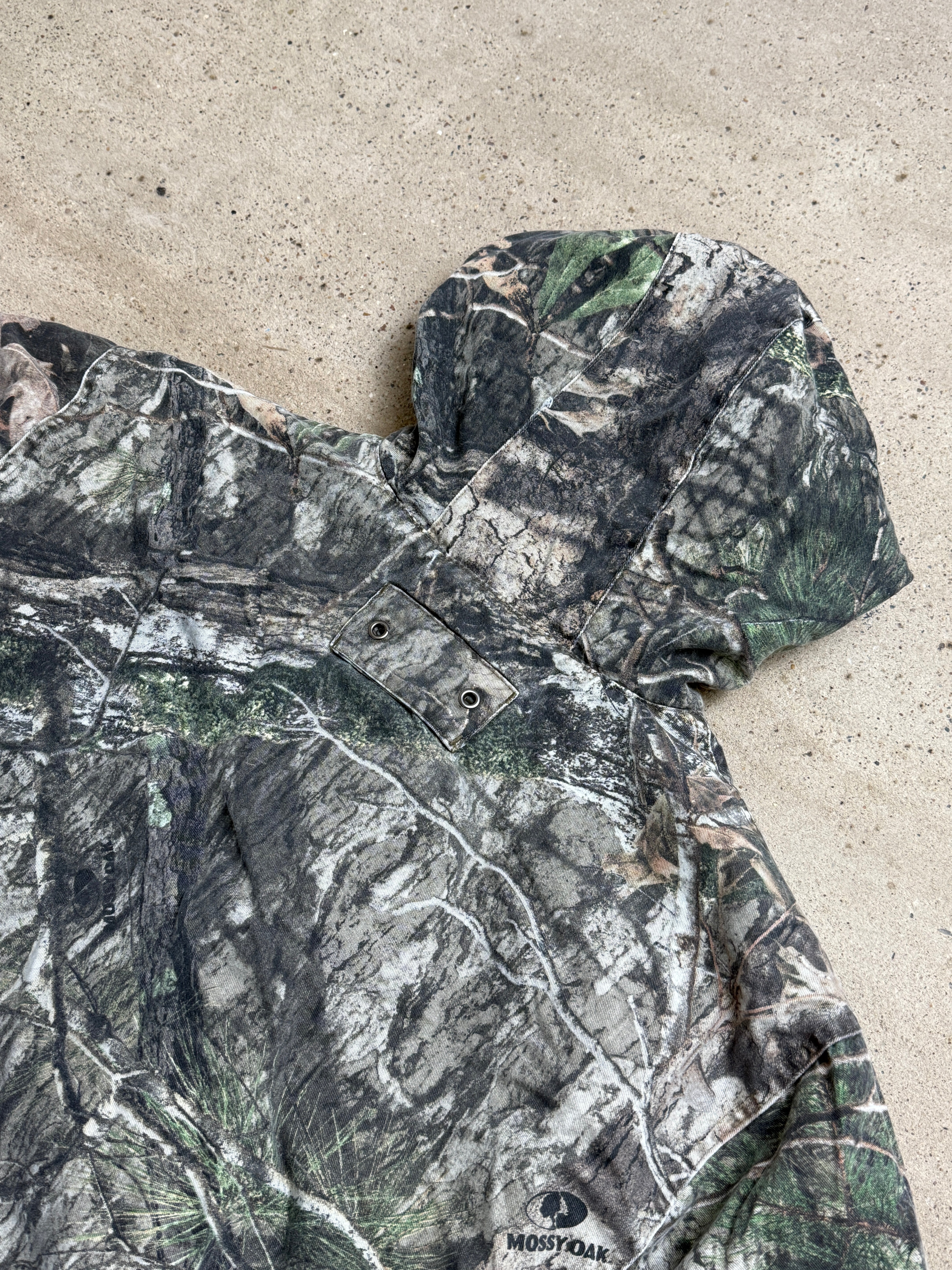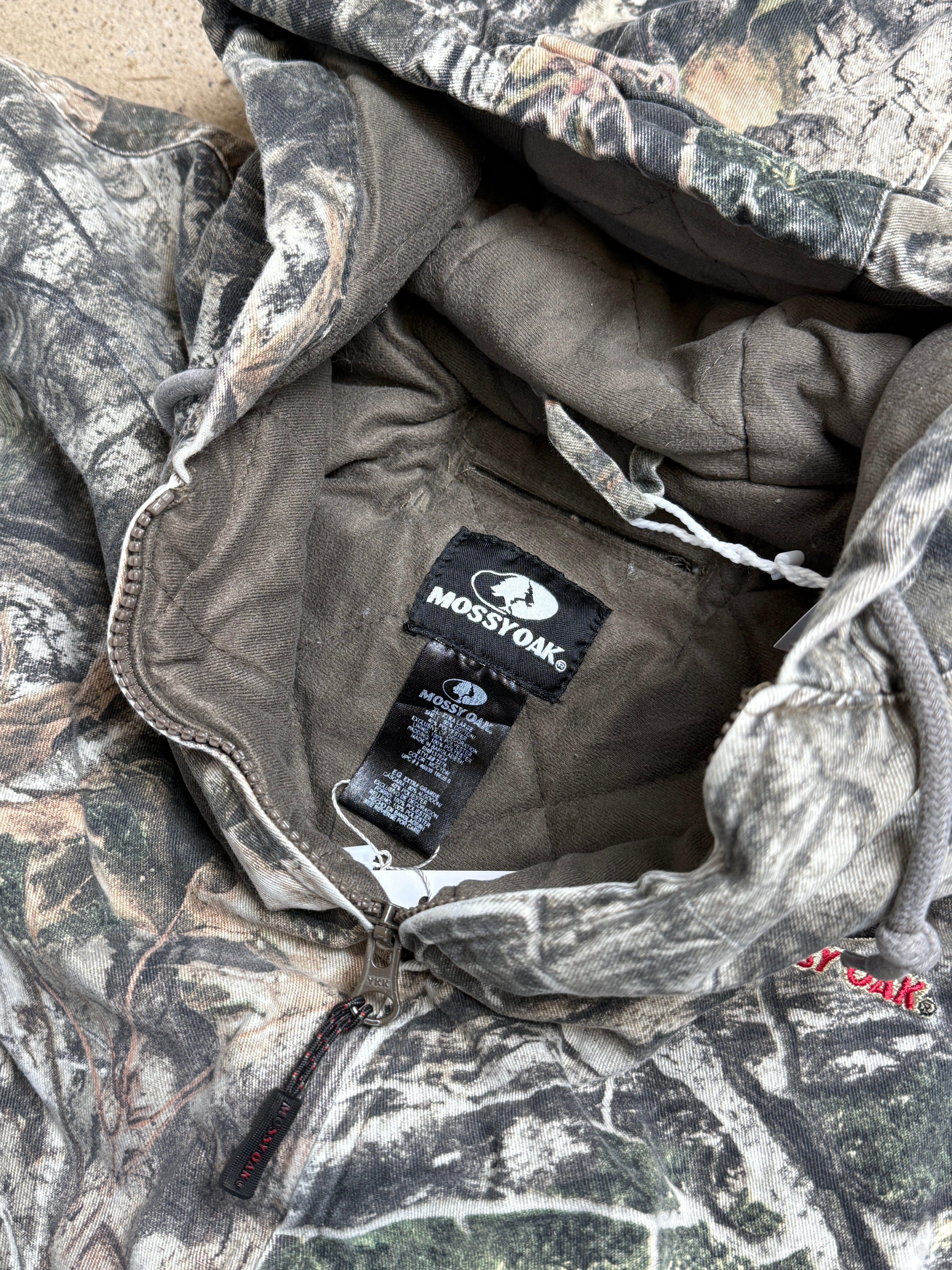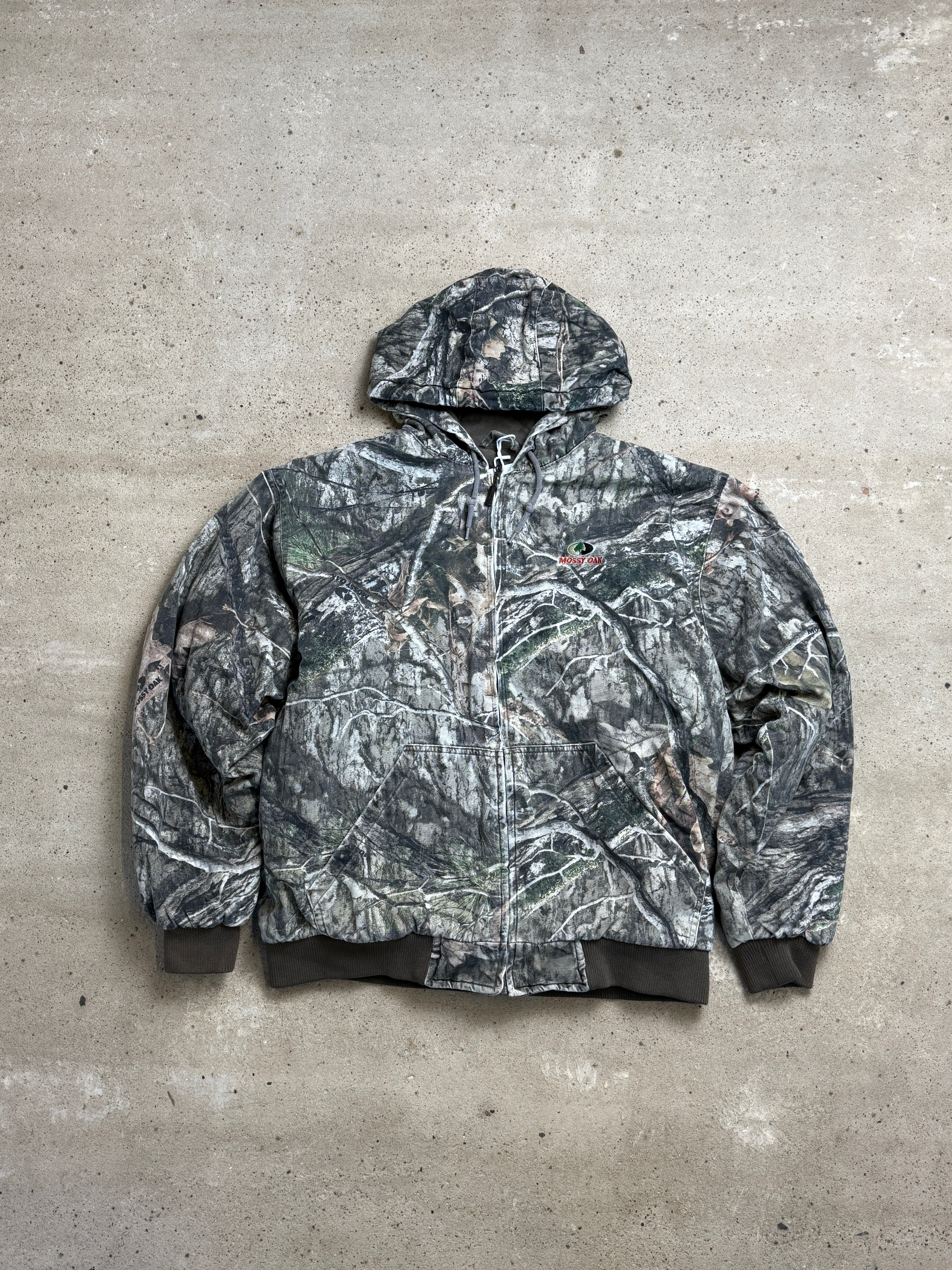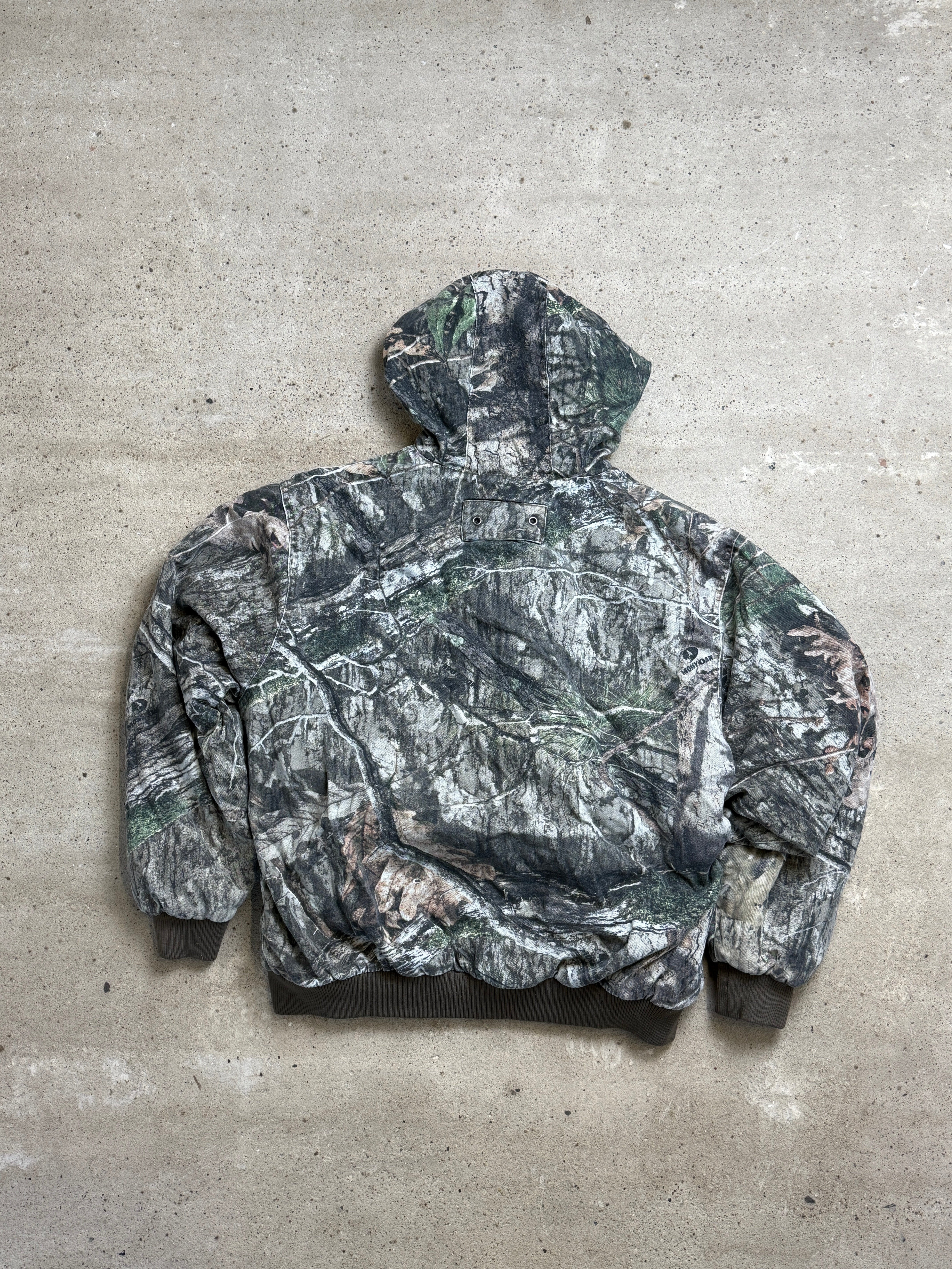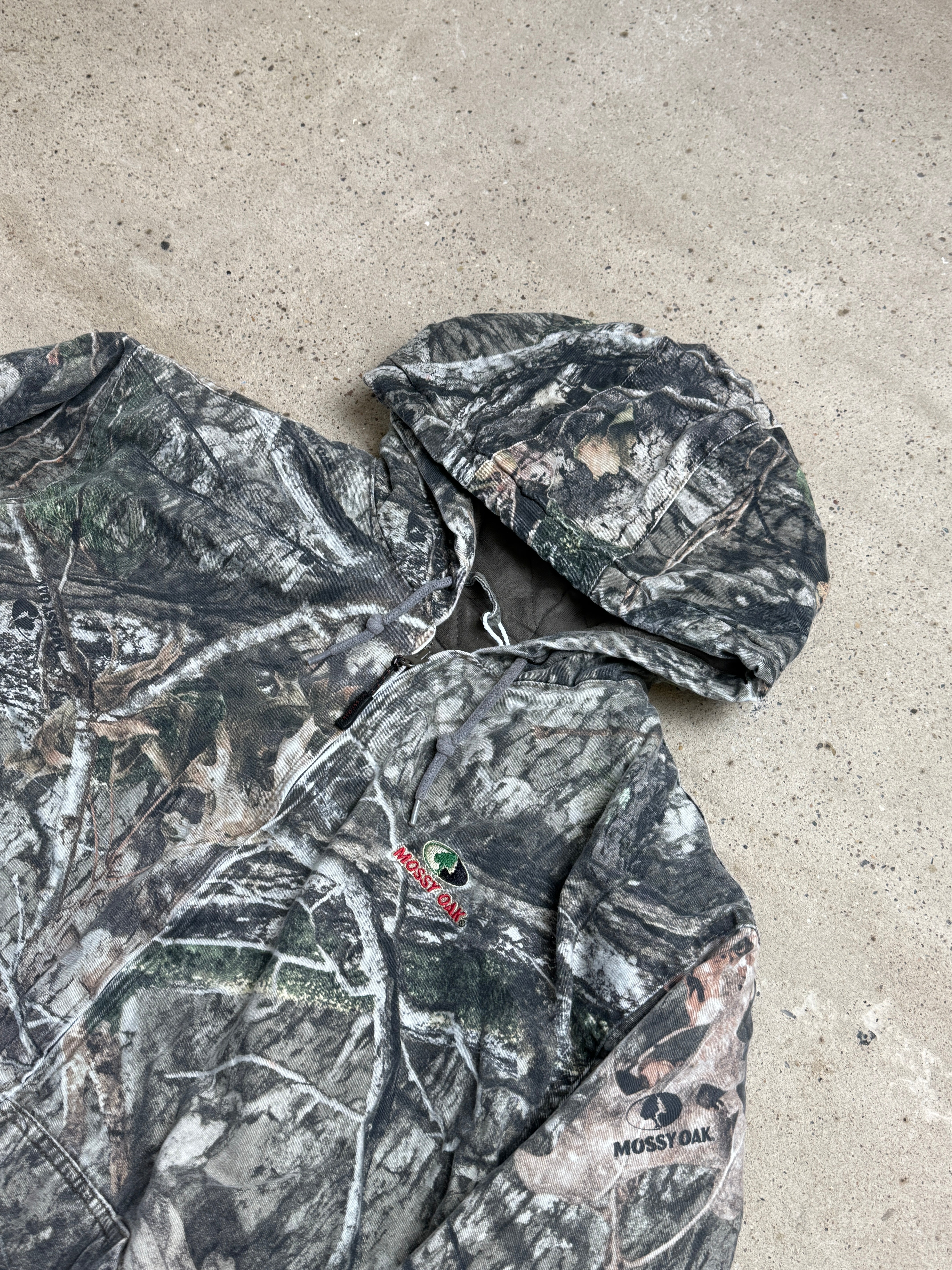 mossy oak, camo jacket, hooded, outdoor, real tree, activewear, woodland, vintage, rugged, camouflage